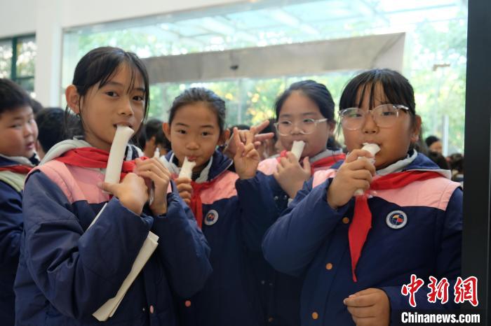 近日,楊允慈(左一)和同學(xué)們一起品嘗剛出爐的寧波年糕。中新社記者 林波 攝
