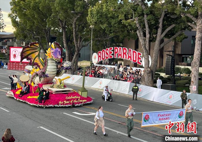 當(dāng)?shù)貢r(shí)間1月1日上午,第135屆美國(guó)玫瑰花車游行在加利福尼亞州歷史文化名城帕薩迪納市舉行。圖為南加州阿罕布拉市帶來(lái)的“慶祝龍年”主題花車。 中新社記者 張朔 攝