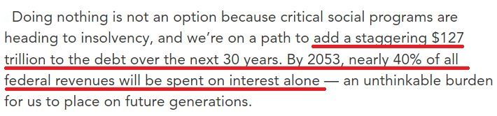根據(jù)該智庫(kù)的預(yù)測(cè),美國(guó)在未來(lái)30年將在現(xiàn)有基礎(chǔ)上再增加127萬(wàn)億美元債務(wù);到2053年,光是利息成本就要用掉近40%的聯(lián)邦財(cái)政收入。