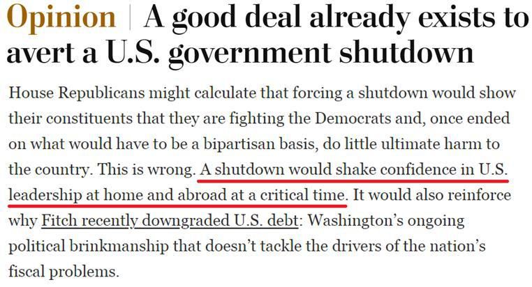 有美媒評(píng)論指出,政府關(guān)門將動(dòng)搖國(guó)內(nèi)外對(duì)美國(guó)領(lǐng)導(dǎo)層的信心,而這也將進(jìn)一步坐實(shí)國(guó)際評(píng)級(jí)機(jī)構(gòu)對(duì)美國(guó)信用“降級(jí)”的原因:華盛頓持續(xù)的政治脅迫政策無(wú)法解決日益惡化的財(cái)政問(wèn)題。