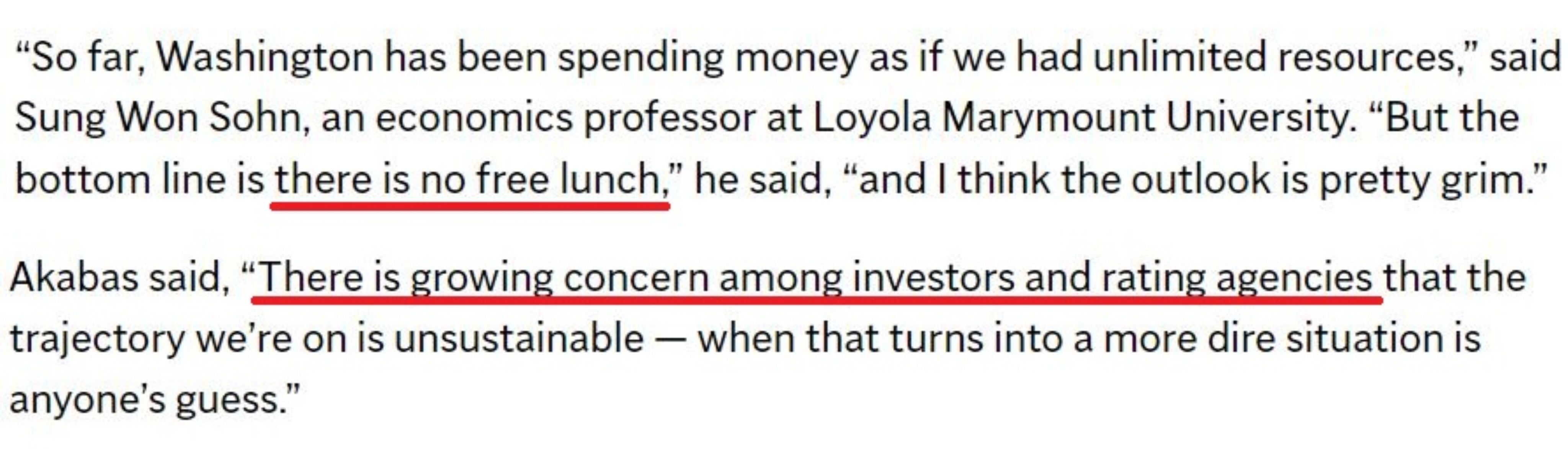 用洛杉磯洛約拉馬利蒙特大學(xué)經(jīng)濟(jì)專家的話說(shuō),“到目前為止,華盛頓一直在花錢,好像我們擁有無(wú)限的資源,但天下終究沒有免費(fèi)的午餐”。