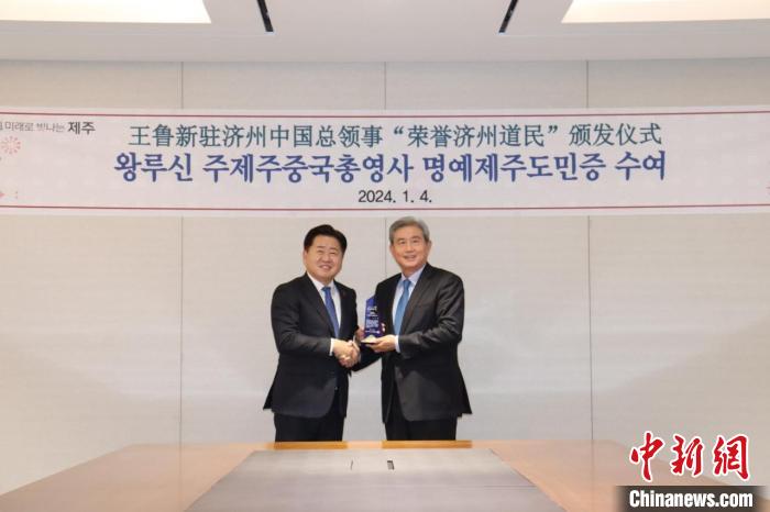 1月4日,韓國濟(jì)州道知事吳憐勛(左)向中國駐濟(jì)州總領(lǐng)事王魯新頒授“榮譽濟(jì)州道民”證書。(中國駐濟(jì)州總領(lǐng)事館供圖)