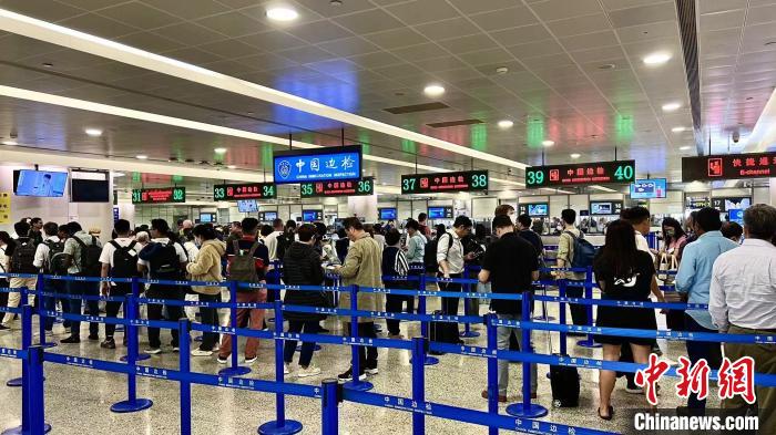上海浦東國(guó)際機(jī)場(chǎng)邊檢查驗(yàn)大廳,旅客有序排隊(duì)候檢。黃波 攝