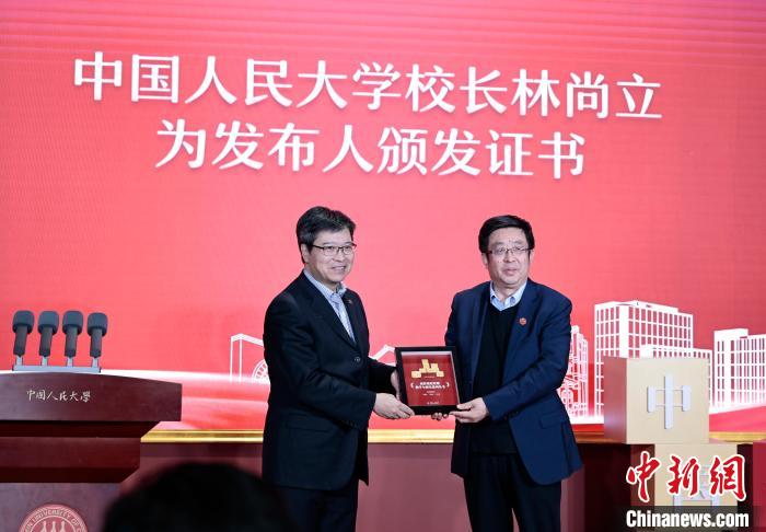 中國人民大學(xué)校長林尚立為本次活動成果發(fā)布人頒發(fā)證書。