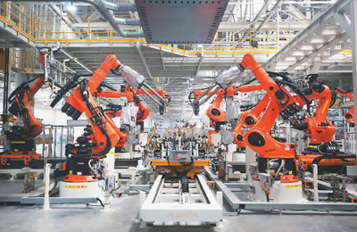 圖為在安徽合肥拍攝的大眾安徽模塊化電驅(qū)動(dòng)平臺(tái)工廠(chǎng)車(chē)身車(chē)間一角。