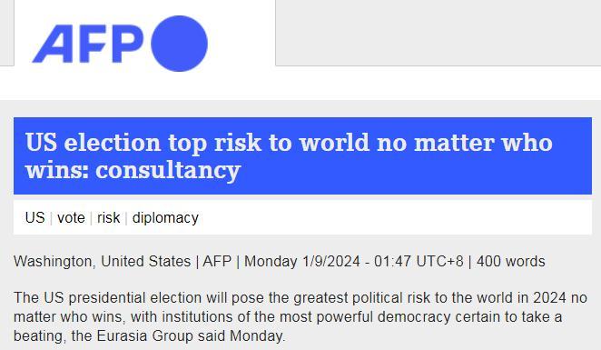中新網(wǎng)1月10日電 據(jù)法新社報(bào)道,日前,政治風(fēng)險(xiǎn)咨詢公司歐亞集團(tuán)表示,無論誰獲勝,2024年美國(guó)總統(tǒng)選舉都將給世界帶來最大政治風(fēng)險(xiǎn),美國(guó)制度將會(huì)受到打擊。