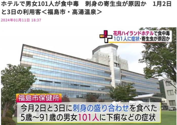 中新網(wǎng)1月12日電 據(jù)日本福島電視臺11日援引福島市保健所的消息,1月2日和3日,福島市一處溫泉酒店發(fā)生了大規(guī)模食物中毒事件,101人出現(xiàn)上吐下瀉等癥狀。