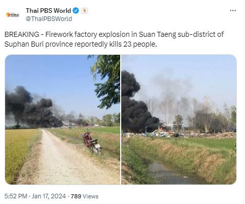 另據(jù)泰國公共廣播服務(wù)公司下屬新聞網(wǎng)站“Thai PBS World”社交媒體賬號消息,當(dāng)?shù)貢r間17日,泰國中部素攀武里府一家煙花廠爆炸,目前已造成23人死亡,多人受傷。