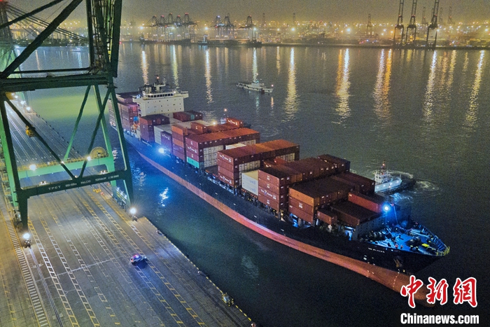 1月16日晚,裝載著2500余噸智利車?yán)遄拥拇笮图b箱班輪“巴赫”號(hào),順利抵達(dá)天津港太平洋國(guó)際集裝箱碼頭,標(biāo)志著天津港與南美洲直航的首條“車?yán)遄涌炀€”正式開通?!败?yán)遄涌炀€”始發(fā)于智利圣安東尼奧港,直抵天津港。未來(lái)一周,還將有2艘次智利車?yán)遄迂洿诌_(dá)天津港,累計(jì)8300噸車?yán)遄蛹捌渌厦乐蕻a(chǎn)品從天津港上岸。(無(wú)人機(jī)照片) 中新社記者 佟郁 攝