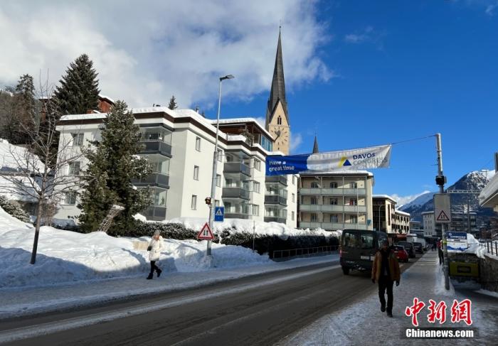 資料圖:當?shù)貢r間1月15日,達沃斯街道上掛起會議相關景觀裝飾。