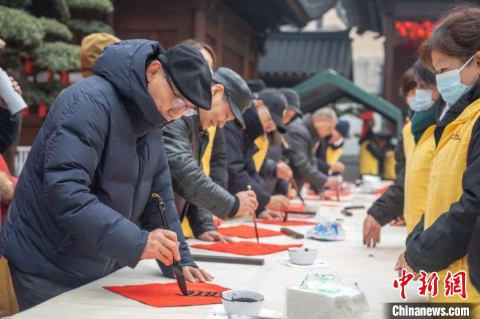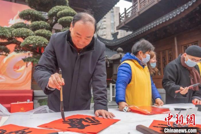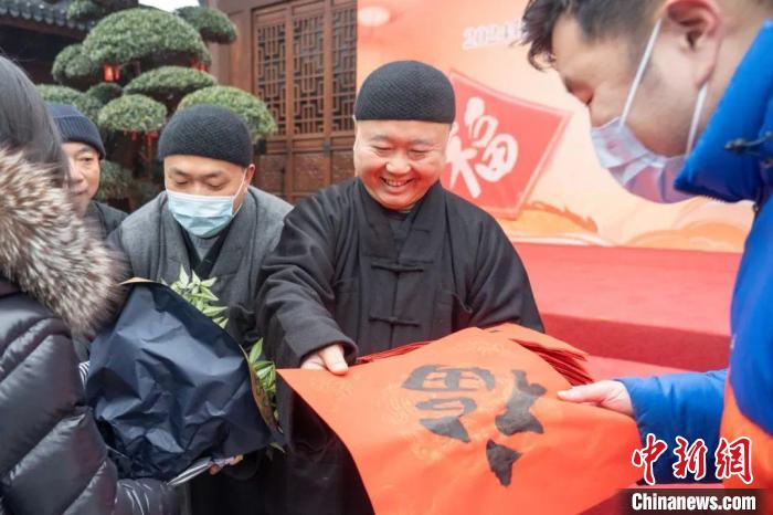 中新網(wǎng)上海1月21日電(記者 范宇斌)21日,“龍興歲時旺 送福百萬家”——2024年玉佛禪寺新春送?;顒釉谏虾S穹鸲U寺啟動。上海覺群書畫院理事長、玉佛禪寺方丈覺醒法師表示,迎新貼“?!弊质莻鹘y(tǒng)的年俗文化,也是中華兒女對于美好生活、光明未來的共同期待。
