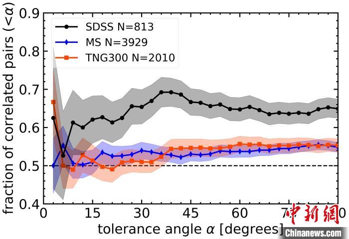 同向運(yùn)動衛(wèi)星星系對占比隨張角的變化:黑色帶圓點的實線為觀測結(jié)果,藍(lán)線和紅線為理論模擬預(yù)測結(jié)果,黑色虛線為隨機(jī)分布,陰影區(qū)為自舉標(biāo)準(zhǔn)誤差范圍。中國科學(xué)院國家天文臺/供圖