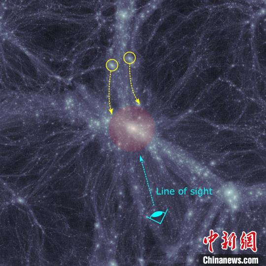 往大質(zhì)量星系群中掉落的星系(圖片來源:廖世鴻),紅色區(qū)域為一個大質(zhì)量星系群,黃色圓圈里的為正沿著大尺度纖維狀結(jié)構(gòu)掉落的星系,它們相對于中央星系沿相同方向運(yùn)動。中國科學(xué)院國家天文臺/供圖