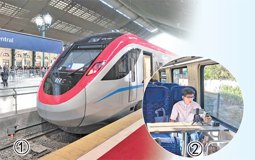 圖①:中企研制的電力內(nèi)燃雙動(dòng)力動(dòng)車組列車??吭谥抢サ貋喐缰醒胲囌尽?/p>