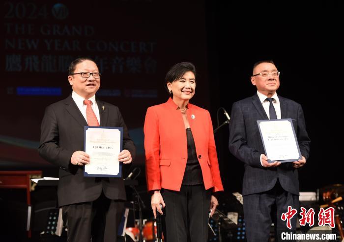 當(dāng)?shù)貢r間1月27日晚,以紀念中美建交45周年為主題的鷹飛龍騰新年音樂會在美國洛杉磯唱響。圖為美國聯(lián)邦眾議員趙美心(中)向美國鷹龍傳媒董事長蘇彥韜(左)等主辦方代表頒發(fā)賀狀?!≈行律缬浾?張朔 攝