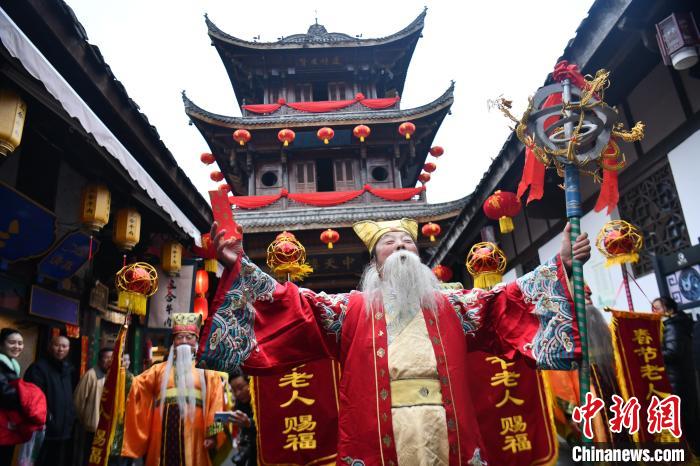 中新網(wǎng)閬中2月4日電 題:走進(jìn)春節(jié)文化之鄉(xiāng):春倌說春迎新年 春節(jié)老人賜福忙