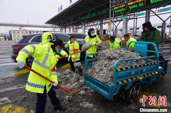 圖為2月1日,路政工作人員在鄭州機(jī)場高速鄭州南站除雪。中新網(wǎng)記者 韓章云 攝
