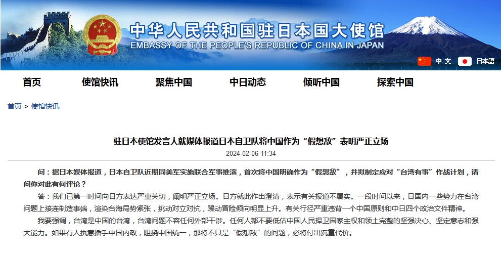 中新網(wǎng)2月6日電 據(jù)日本媒體報道,日本自衛(wèi)隊近期同美軍實施聯(lián)合軍事推演,首次將中國明確作為“假想敵”,并擬制定應(yīng)對“臺灣有事”作戰(zhàn)計劃。對此,中國駐日本使館發(fā)言人6日表示,我們已第一時間向日方表達嚴重關(guān)切,闡明嚴正立場。日方就此作出澄清,表示有關(guān)報道不屬實。一段時間以來,日國內(nèi)一些勢力在臺灣問題上接連制造事端,渲染臺海局勢緊張,挑動對立對抗,躁動冒險傾向明顯上升。有關(guān)行徑嚴重違背一個中國原則和中日四個政治文件精神。