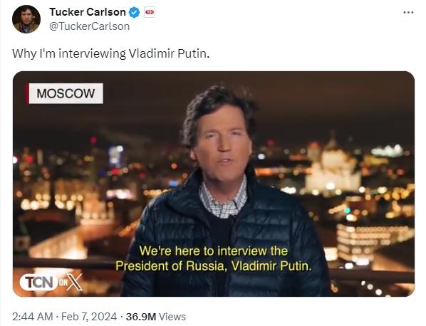 據(jù)介紹,卡爾森是??怂闺娨暸_的一名當(dāng)紅主播,主要負責(zé)一檔名為《卡爾森今夜秀》的新聞節(jié)目。他在2023年4月被??怂菇夤?,隨后在社交平臺X上繼續(xù)發(fā)布采訪節(jié)目。路透社稱,卡爾森2023年8月在X上發(fā)布的對美國前總統(tǒng)特朗普的采訪獲得了上億播放量。