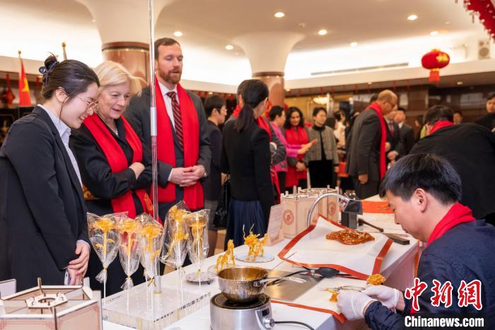 當(dāng)?shù)貢r(shí)間2月6日,中國(guó)常駐聯(lián)合國(guó)代表團(tuán)在紐約駐地舉行龍年新春招待會(huì)。圖為來賓們?cè)谔钱嬚古_(tái)觀看糖人制作工藝。 中新社記者 王帆 攝