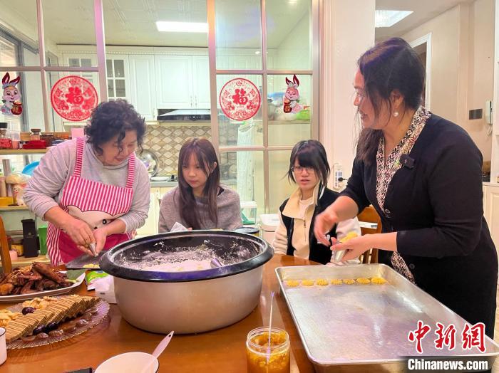 2月5日,蔡蘭妹兒媳婦李月瑤(右一)與家人一起制作印尼糕點?! №f佳秀 攝