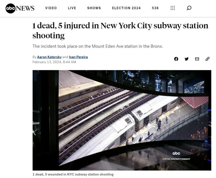 中新網(wǎng)2月13日電 據(jù)美國廣播公司(ABC)報(bào)道,當(dāng)?shù)貢r間12日下午,美國紐約布朗克斯一個地鐵站發(fā)生槍擊事件,造成1人死亡,5人受傷。
