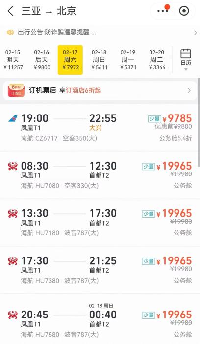 中新財經(jīng)記者14日晚間查詢發(fā)現(xiàn),2月15日至2月19日,??凇⑷齺喴约碍偤V憋w北京和上海兩大目的地的經(jīng)濟艙機票均已售罄。15日至17日的回程高峰期,公務(wù)艙機票價格集中在萬元上下。17日當天,從三亞直飛北京的公務(wù)艙機票價格最高已接近兩萬元。