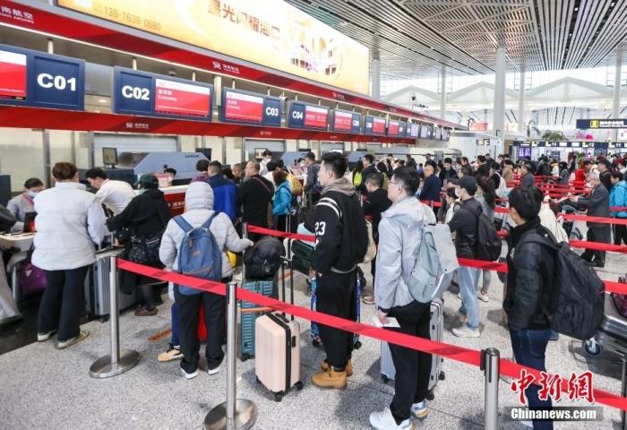 2月8日,海南??冢每驮诤?诿捞m國際機場T2航站樓排隊辦理值機。春節(jié)臨近,??诿捞m國際機場客流攀升。中新社記者 駱云飛 攝