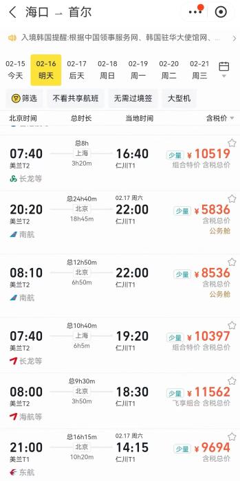 在社交平臺上,一些網(wǎng)友還提供了“聯(lián)程甩尾”方案。例如,從??谥憋w北京,16日票價要近萬元,但如果選擇海口飛往首爾,從北京中轉(zhuǎn),票價最低僅需五千多元。