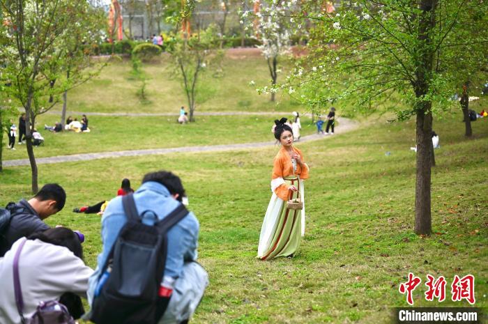 2月17日,廣西南寧青秀山風(fēng)景區(qū)內(nèi),游客身著漢服打卡拍攝?!∮峋?攝