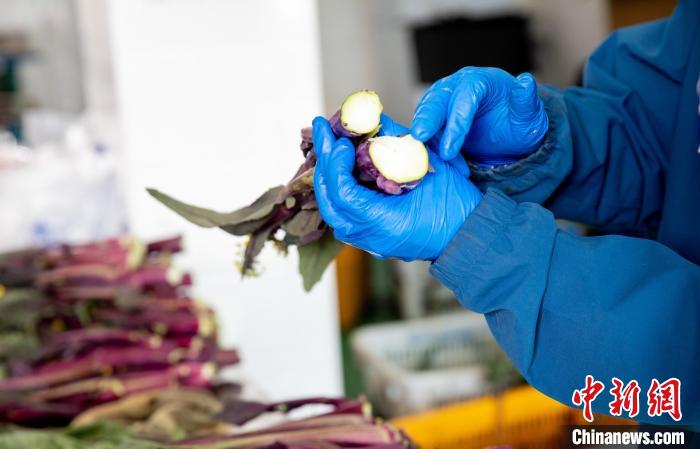 每天清早,趁露水未干,菜農便穿梭于田壟間,長勢繁茂的菜薹如女子手腕粗細,葉片紅得發(fā)紫。菜農手握掐刀,瞄準基部輕輕一掐,汁水四溢,拭塵土、扒外皮,即可生食。若是經(jīng)歷寒風雪霜,更是甘甜。