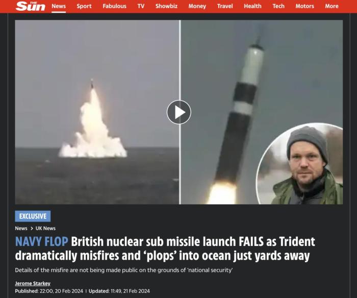 據(jù)《太陽報》報道,英國皇家海軍“先鋒”號核潛艇于1月30日在美國佛羅里達州附近海域,進行了一次“三叉戟II”型導(dǎo)彈發(fā)射演習(xí),然而發(fā)射的導(dǎo)彈第一級推進器并未按計劃點燃,導(dǎo)致這枚重達58噸的導(dǎo)彈(裝有假彈頭)掉進海中。