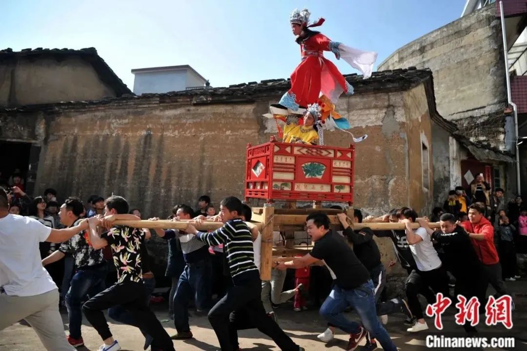 每年正月初十及正月二十六,潭頭鎮(zhèn)厚福村都會(huì)舉行傳統(tǒng)游神民俗活動(dòng),至今已有400多年的歷史。圖為傳統(tǒng)游神民俗活動(dòng)中的巡游隊(duì)伍簇?fù)碇ι駥⒌娜俗呓执?。中新社記?呂明 攝