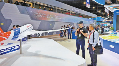 在中國商飛展區(qū),觀眾在認(rèn)真觀摩C929飛機(jī)模型。