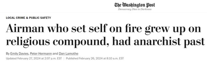 標(biāo)題為《自焚的空軍在宗教場所長大,有無政府主義的過往》。顯然,這樣的標(biāo)題在強烈暗示布什內(nèi)爾的行為可能受到極端宗教和極左思想的影響。
