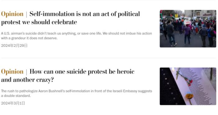 實際上,因為布什內(nèi)爾在直播中的話有非常多的政治標(biāo)簽,標(biāo)題想要體現(xiàn)自焚事件的原因本來是非常容易的。但在西方主流媒體的報道標(biāo)題中,最能直觀表明布什內(nèi)爾行為原因的三個關(guān)鍵詞——“加沙”(Gaza)“種族滅絕”(genocide)乃至“抗議”(protest)字樣均未出現(xiàn)。