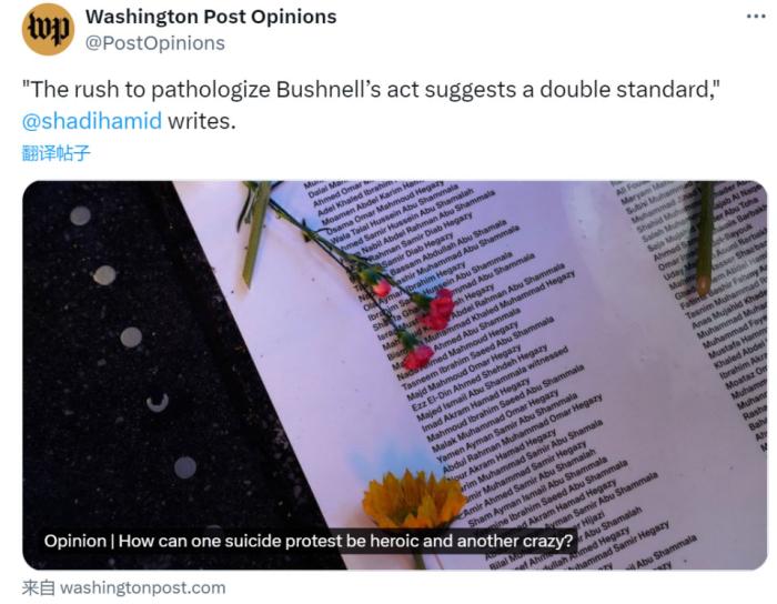 要知道,去年12月就已經(jīng)有美國人在以色列駐亞特蘭大領(lǐng)事館門口,拿著巴勒斯坦國旗自焚抗議,而這位女士至今沒有報道提到過她的姓名。很可能布什內(nèi)爾這次事件的策劃,是吸取過亞特蘭大自焚案教訓(xùn)的。即便如此,他也躲不過惡意的編排。