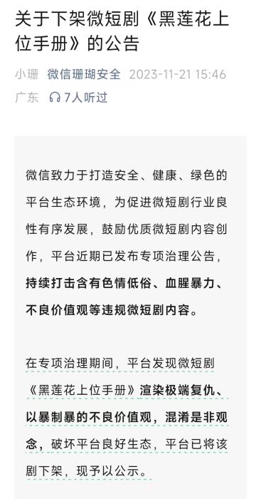 然而,良莠不齊一直是微短劇的行業(yè)痛點。2023年11月,《黑蓮花上位手冊》上線一周之內(nèi)被平臺下架。