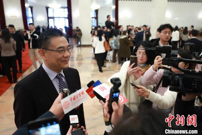 3月8日,十四屆全國(guó)人大二次會(huì)議在北京人民大會(huì)堂舉行第二次全體會(huì)議。圖為會(huì)后,港區(qū)全國(guó)人大代表?xiàng)畹卤蠼邮苊襟w采訪?!≈行律缬浾?蔣啟明 攝