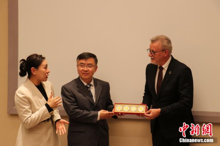中國社會科學(xué)院領(lǐng)導(dǎo)與巴西坎皮納斯州立大學(xué)校長互換禮物。 中新網(wǎng)黃方 攝