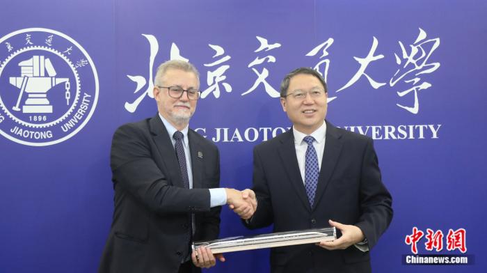 北京交通大學(xué)校長余祖俊和巴西坎皮納斯州立大學(xué)校長安東尼奧·梅雷萊斯(Antonio José de Almeida Meirelles)互贈禮物。 中新網(wǎng)吳家駒 攝