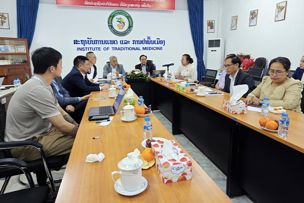 老撾衛(wèi)生傳統(tǒng)醫(yī)藥研究院黨委書記,院長Dr. Bounleuane Douangdeuane、老撾衛(wèi)生熱帶醫(yī)學(xué)與公共衛(wèi)生研究院創(chuàng)始院長Prof.Dr.Boungnong Boupha、張秋利博士商談合作具體事宜