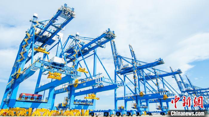 青島港自動(dòng)化碼頭,振華重工建造的自動(dòng)化岸橋?!≌袢A重工供圖