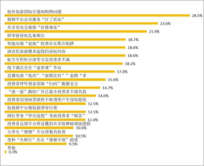 中新網(wǎng)3月14日電(中新財(cái)經(jīng)記者 謝藝觀)3月14日,中國消費(fèi)者協(xié)會對外發(fā)布2024年“激發(fā)消費(fèi)活力”消費(fèi)維權(quán)年主題調(diào)查報告,調(diào)查結(jié)果顯示,低價旅游團(tuán)暗存強(qiáng)制購物、視頻平臺會員服務(wù)“打了折扣”、共享充電寶“好借難還”引共鳴。