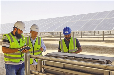 由中國企業(yè)總承包的阿聯(lián)酋艾爾達芙拉光伏電站可供20萬戶居民用電,每年減少二氧化碳排放240萬噸,使清潔能源在阿聯(lián)酋總能源結(jié)構(gòu)中的比重提高到13%以上。圖為中外員工在艾爾達芙拉光伏電站工作。