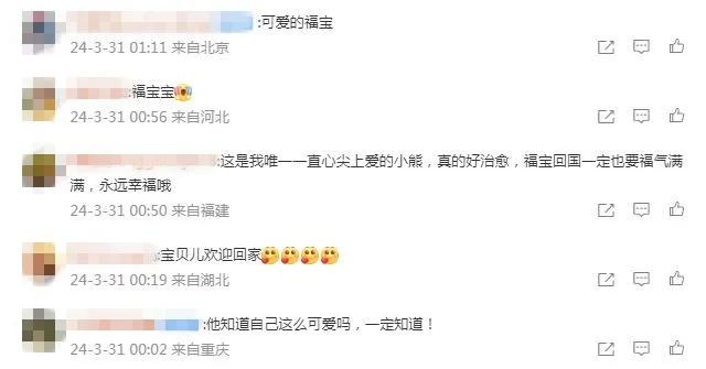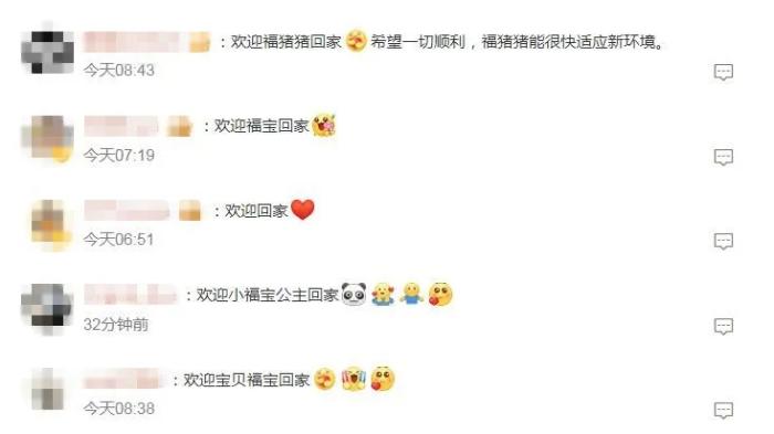 有網友寫道,祝愿“福寶”一切順利,“能很快適應新環(huán)境”。還有網友表示,“福寶回國后一定也要福氣滿滿,永遠幸福哦!”