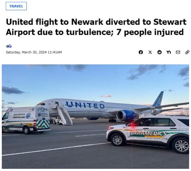 據(jù)報道,執(zhí)飛這一航班的機型為波音787,原計劃從特拉維夫飛往新澤西州紐瓦克國際機場,機上有300多名乘客和機組人員。當(dāng)天下午約6:45,由于準(zhǔn)備降落時突遇“大風(fēng)和湍急氣流”,飛機改道飛往紐約斯圖爾特國際機場。