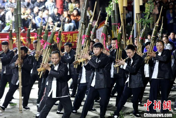 圖為4月4日清明節(jié),廣西三江侗族自治縣獨峒鎮(zhèn)10余支蘆笙隊齊聚一堂,以蘆笙踩堂、蘆笙比響等形式,展示侗鄉(xiāng)多彩風情。龔普康攝