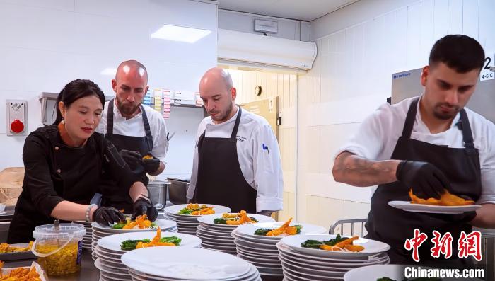 2024年2月22日,夏蓉(左)與巴塞羅那洲際酒店的廚師團(tuán)隊(duì)合作為宴會(huì)制作中餐。受訪者供圖
