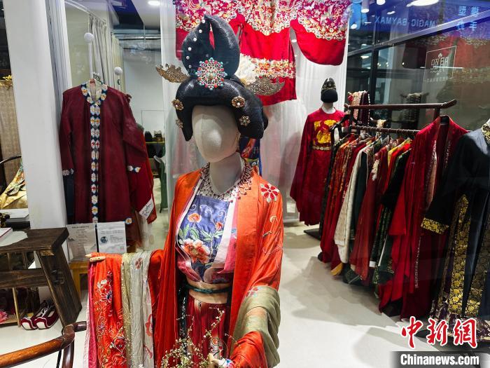 上海明熙傳統(tǒng)漢服禮服館內(nèi),擺放著唐代、明代、宋代等各個(gè)朝代,不同款式的漢服。楊海燕 攝